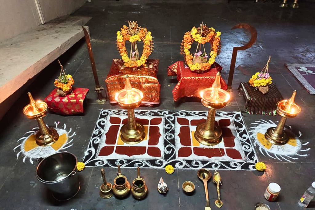 In this ritual, sacred mantras of Goddess Bhadrakali are chanted and special offerings are made into the holy fire. The fire is believed to carry our prayers directly to the Goddess. Through this sacred ceremony, devotees seek protection from enemies, negative energy, and unseen problems.